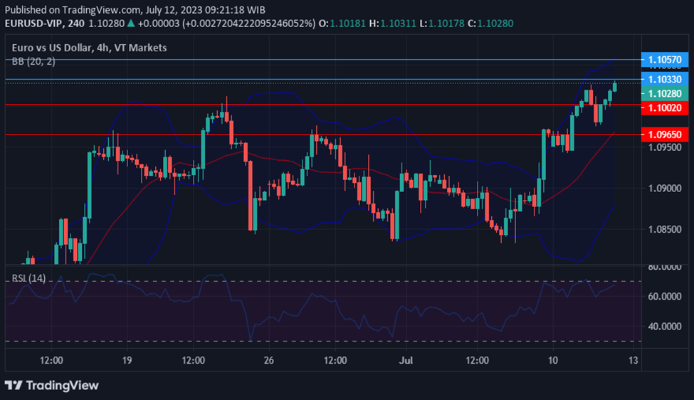 This suggests the potential for the price to reach the upper band of the Bollinger Bands. Additionally, the Relative Strength Index (RSI) currently stands at 69, further indicating a bullish trend for the EUR/USD.