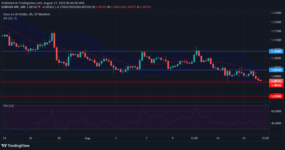 Based on technical analysis, the EUR/USD moves lower on Wednesday, creating a push for the lower band of the Bollinger Bands. Currently, the price is moving around the lower of the Bollinger Bands. The Relative Strength Index (RSI) presently stands at 34, signifying that the EUR/USD is currently in a bearish sentiment.