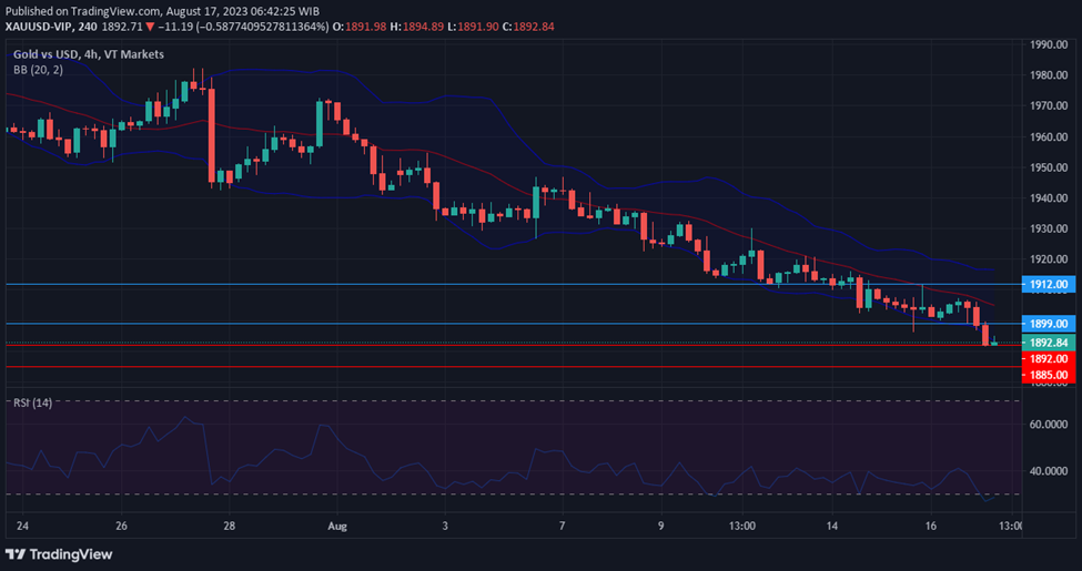 Based on technical analysis, the XAU/USD witnessed a slight decrease on Wednesday, the price managed to create a push for the lower band of the Bollinger Bands during this movement. Currently, the price is moving at the lower band of the Bollinger Bands. The Relative Strength Index (RSI) is currently at 28, indicating that the XAU/USD pair is exhibiting a somewhat bearish sentiment.