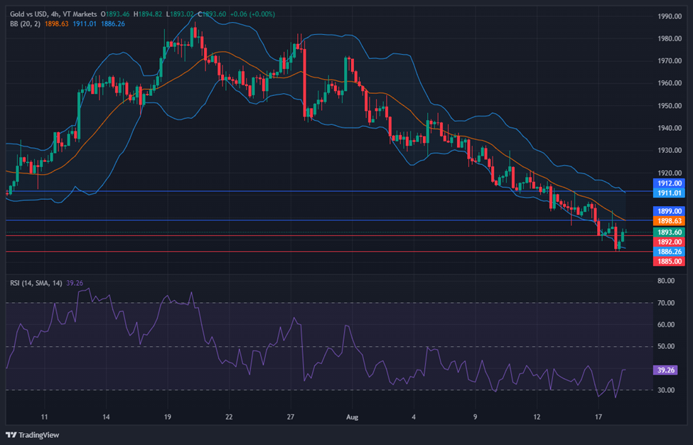 Gold prices are facing downward pressure, falling to their lowest since March and hovering around the $1,890 mark, as a somber market sentiment persists. The risk-averse stance among investors was triggered by the US Federal Reserve’s recent release of the August meeting minutes, revealing apprehensions regarding inflation risks and potential for further rate hikes. This uncertainty extends beyond the Fed, with the Bank of England hinting at prolonged rate hikes and the Reserve Bank of New Zealand considering potential increases in the future. Amid these central bank concerns, gold’s value remains under strain.