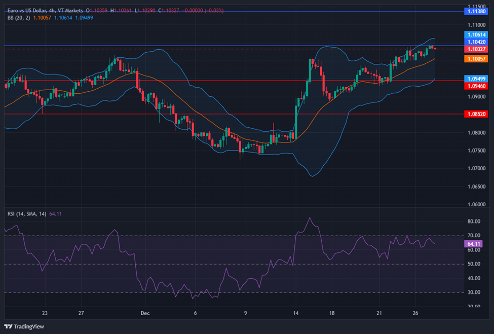 On Tuesday, the EUR/USD moved slightly higher and tried to reach the upper band of the Bollinger Bands. Currently, the price moving slightly below the upper band, suggesting a potential upward movement. Notably, the Relative Strength Index (RSI) maintains its position at 64, signaling a neutral but slightly bullish outlook for this currency pair.