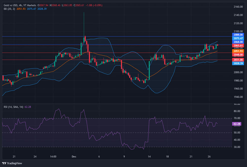 In the early Asian session, Gold (XAU/USD) maintained its position above $2,060 despite a marginal 0.09% dip, set amidst a quiet trading week expected due to light volumes in the final stretch of 2023. The US Dollar weakened against its counterparts, pressing the US Dollar Index (DXY) to its lowest since July near 101.45. As Treasury yields edged lower, resting at 3.89%, expectations of Federal Reserve easing intensified, with the market pricing in potential cuts in January and fully anticipating cuts by March 2024. This dovish stance, alongside recent data showing a softer increase in the Core PCE, has positioned lower interest rates as a potential boon for gold, reducing its opportunity cost as a non-yielding asset. Geopolitical tensions in the Middle East, particularly Yemen’s threat to Red Sea shipping and Iran’s potential actions in the Gibraltar Strait, are adding pressure, potentially elevating gold’s safe-haven appeal. Traders are keenly observing the unfolding geopolitical landscape alongside upcoming economic indicators like the US Richmond Fed Manufacturing Index and Initial Jobless Claims.