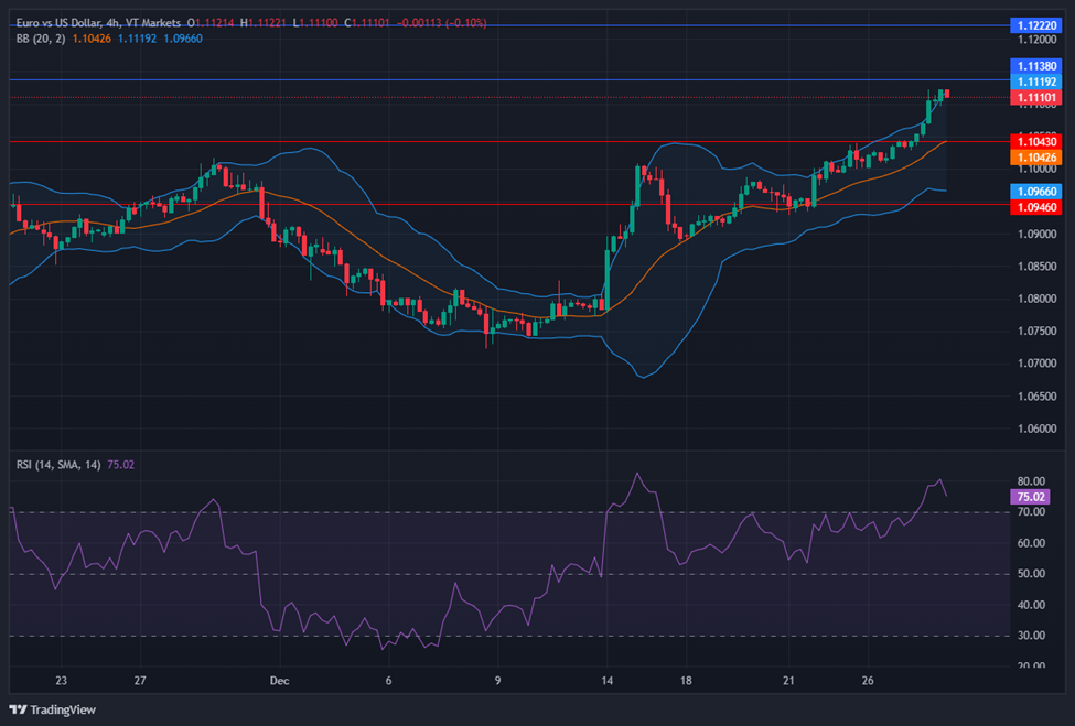 The EUR/USD rallied past the 1.1100 mark propelled by a weakening US Dollar, sinking below 101.00 in the DXY index for the first time in five months. With US Treasury yields hitting new lows amidst expectations of Federal Reserve rate cuts in the upcoming year, the Dollar faced downward pressure while equity markets remained buoyant. Despite quiet trading, anticipation grows for crucial reports like the US weekly Jobless Claims and Spain’s preliminary inflation figures. As 2023 concludes, the serene market conditions continue to weigh on the Dollar, setting the stage for a pivotal turn with the impending release of US employment data next week.