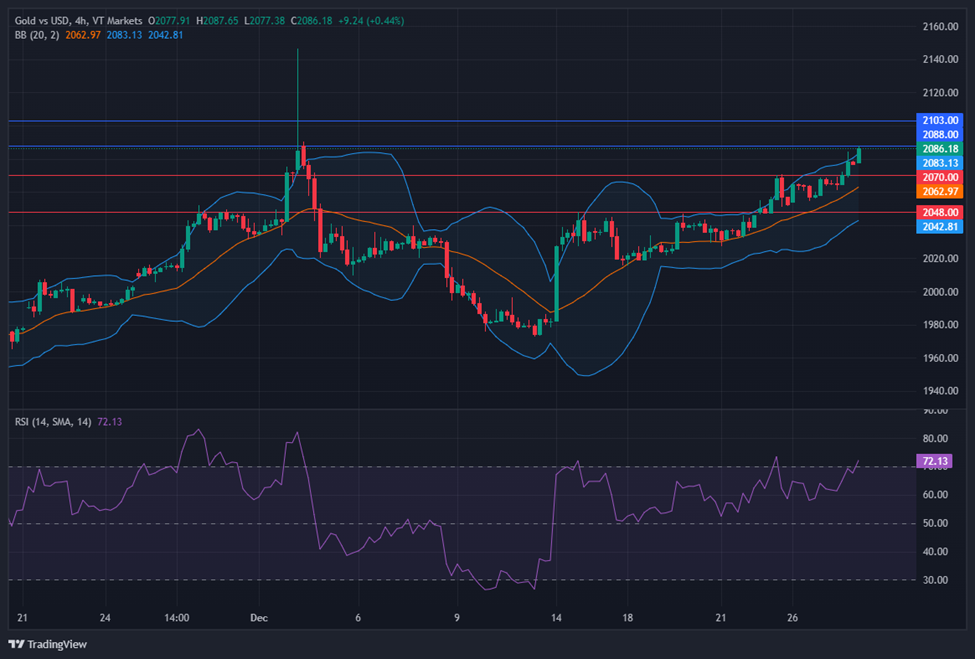 Gold (XAU/USD) is experiencing a pause as the US Dollar (USD) stabilizes amidst market caution, despite sluggish US Treasury bond yields. Investors, returning from the Christmas holiday, are refraining from substantial trades, closely monitoring macroeconomic developments. Uncertainty looms as Fed interest rate cut expectations for 2024 remain ambiguous, leaving Gold buyers in suspense. The dovish sentiment surrounding the Fed’s policy shift strengthened following lackluster data on the Core PCE Price Index, propelling the US Dollar Index to a five-month low. With thin liquidity and cautious trading ahead due to the holiday week, Gold’s trajectory remains vulnerable to intense fluctuations amidst this landscape.